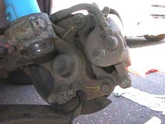 ブレーキキャリパーは裏側から2本の17mmボルト(黄色矢印)で固定されていて、