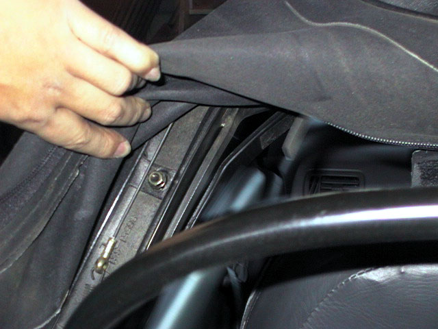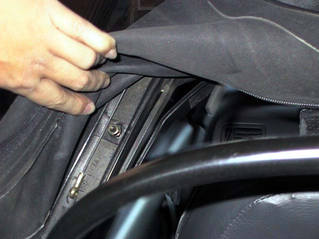 リベットを外したら、リテーナとソフトトップフレームの間から、ソフトトップクロスを引っ張り出します。