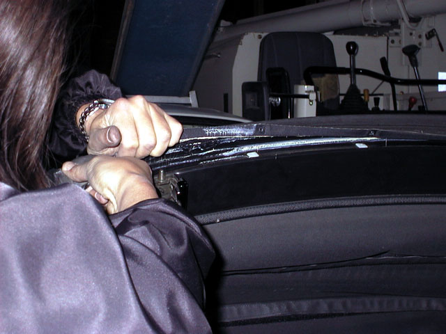 リヤウィンドウのファスナが壊れてしまったので、修理してもらおうと思ったのだが、 脱着工賃が高いので自分で外す事にしました。