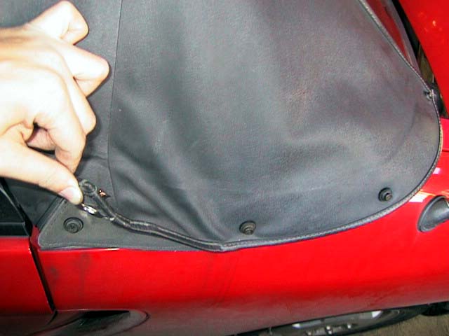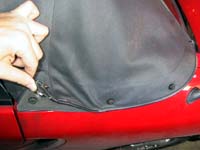 ソフトトップクロスの左右の末端をスナップボルト8つで取り付けます。